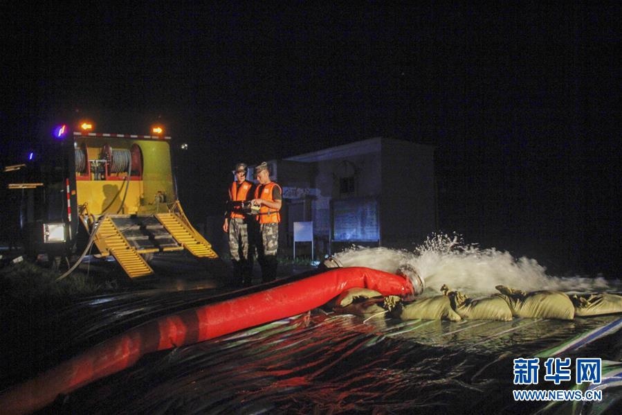 7月13日,在湖北省石首市沙灘子故道,武警第二機(jī)動(dòng)總隊(duì)某支隊(duì)官兵利用大型龍吸水裝備連夜進(jìn)行排澇作業(yè)。新華社發(fā)(岳小東攝)