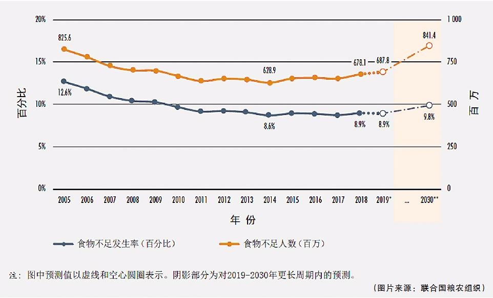 全球食物不足發(fā)生率及人數(shù)逐年統(tǒng)計和預(yù)測圖(圖片來源:聯(lián)合國糧農(nóng)組織)