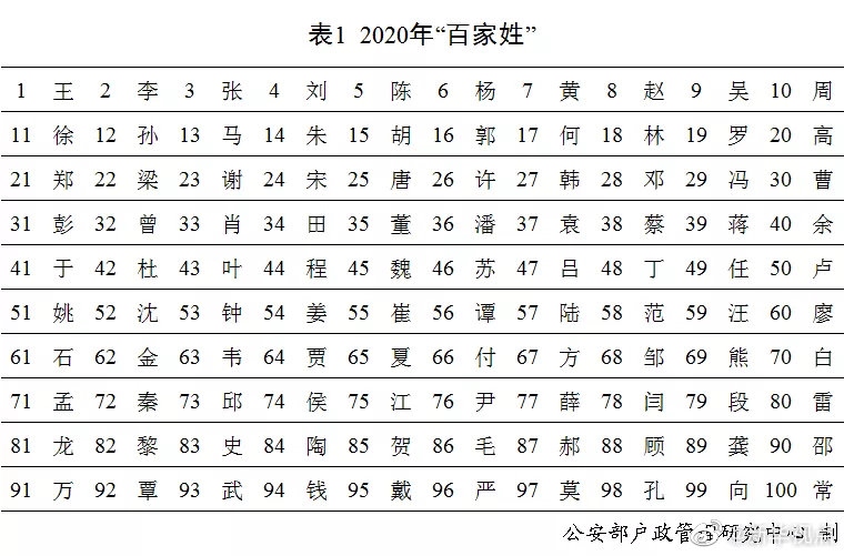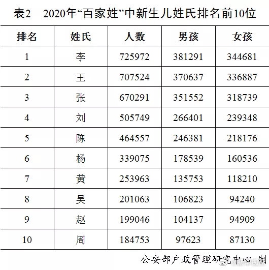 剛剛,公安部戶政管理研究中心二〇二〇年全國姓名報告發(fā)布。按戶籍人口數(shù)量排名,2020年的“百家姓”與2019年相比變化不大。“王”“李”“張”“劉”“陳”依舊名列前五,五大姓氏人口總數(shù)占全國戶籍總?cè)丝诘?0.8%。截止到2020年12月31日,2020年出生并已經(jīng)到公安機關進行戶籍登記的新生兒共1003.5萬,其中男孩529.0萬,占52.7%,女孩474.5萬,占47.3%。2020年“百家姓”中新生兒登記姓氏最多的是“李”,共72.6萬人。2020年出生并已經(jīng)進行戶籍登記的女性新生兒中,使用頻率最高的10個名字依次為:“一諾”“依諾”“欣怡”“梓涵”“語桐”“欣妍”“可欣”“語汐”“雨桐”“夢瑤”。與2019年相比,“一諾”“依諾”“欣怡”依舊位列三甲,“語桐”“可欣”“語汐”“夢瑤”進入前十。(記者 熊豐、任沁沁)