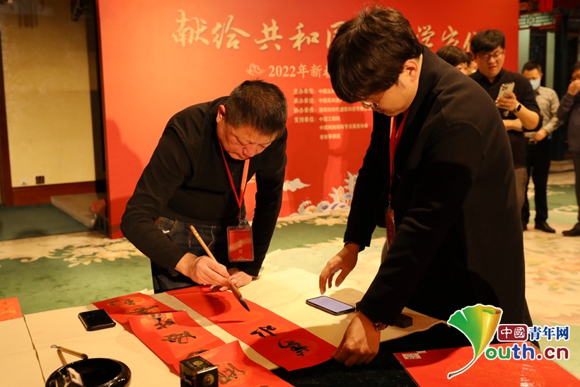 圖為書法家書寫"福"字和春聯(lián)。中國青年網(wǎng)記者 左橙 攝