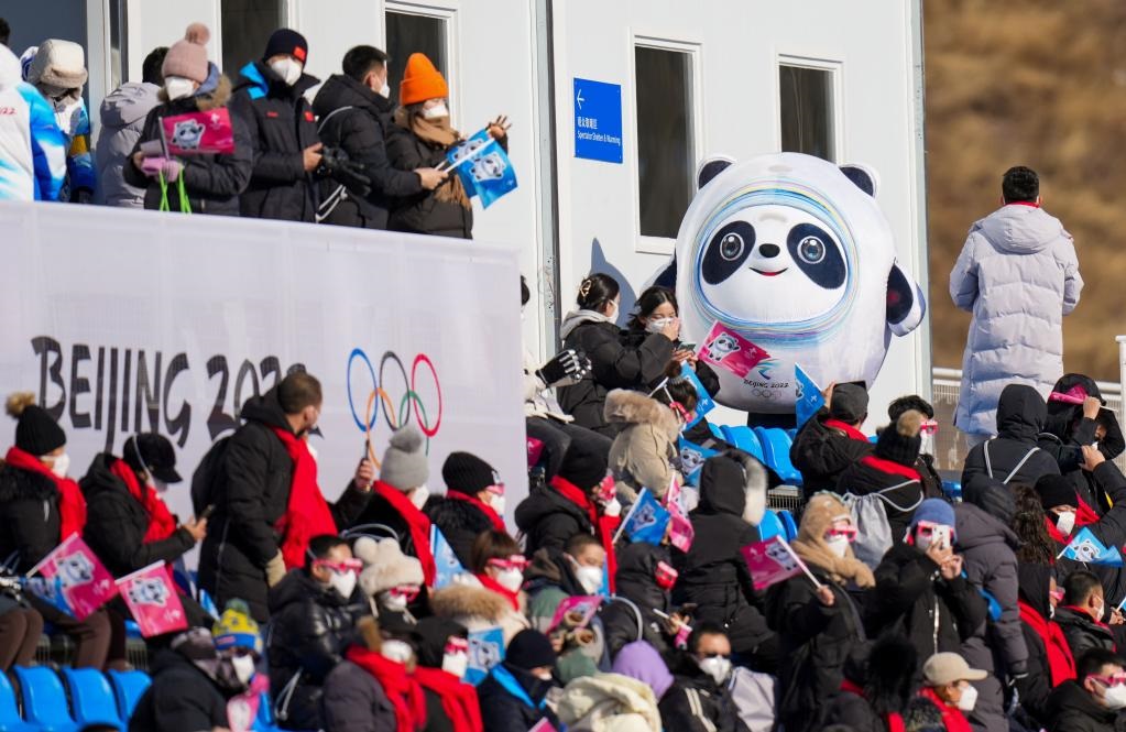 2月6日,2022年北京冬奧會(huì)越野滑雪男子雙追逐(15公里傳統(tǒng)技術(shù)+15公里自由技術(shù))比賽,吉祥物“冰墩墩”在現(xiàn)場(chǎng)與觀眾互動(dòng)。新華社記者劉潺攝