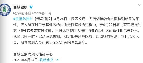 4月24日,我區(qū)(北京市西城區(qū))發(fā)現(xiàn)一名密切接觸者核酸檢測(cè)結(jié)果為陽性。該人員在對(duì)位于其他區(qū)的住所進(jìn)行裝修的過程中,于4月22日與北京市通報(bào)的第145號(hào)感染者有過接觸。當(dāng)日返回我區(qū)大柵欄街道百順社區(qū)的暫住地后未外出。