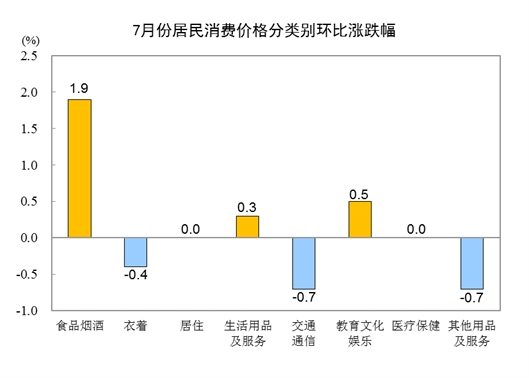 7月份,全國(guó)居民消費(fèi)價(jià)格環(huán)比上漲0.5%。其中,城市上漲0.4%,農(nóng)村上漲0.5%;食品價(jià)格上漲3.0%,非食品價(jià)格下降0.1%;消費(fèi)品價(jià)格上漲0.6%,服務(wù)價(jià)格上漲0.3%。
