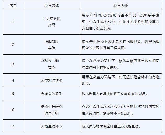 本次太空授課活動將繼續(xù)采取天地互動方式進(jìn)行,3名航天員將在軌介紹展示中國空間站問天實驗艙工作生活場景,演示微重力環(huán)境下毛細(xì)效應(yīng)實驗、水球變“懶”實驗、太空趣味飲水、會調(diào)頭的扳手以及植物生長研究項目介紹,并與地面課堂進(jìn)行互動交流(授課內(nèi)容介紹附后),旨在傳播普及載人航天知識,激發(fā)廣大青少年對科學(xué)的興趣。