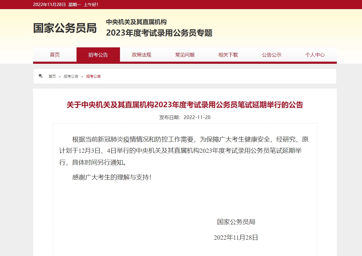 ??根據(jù)當(dāng)前新冠肺炎疫情情況和防控工作需要,為保障廣大考生健康安全,經(jīng)研究,原計(jì)劃于12月3日、4日舉行的中央機(jī)關(guān)及其直屬機(jī)構(gòu)2023年度考試錄用公務(wù)員筆試延期舉行,具體時間另行通知。