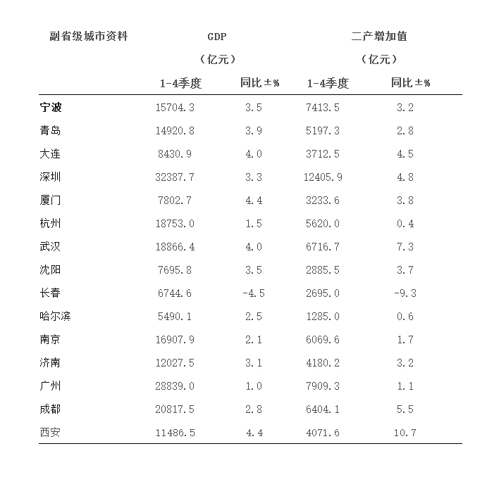 15座副省級(jí)城市中,經(jīng)濟(jì)增速“破4”的有西安(4.4%)、廈門(4.4%)、武漢(4.0%)和大連(4.0%),長(zhǎng)春增速告負(fù),為-4.5%。
