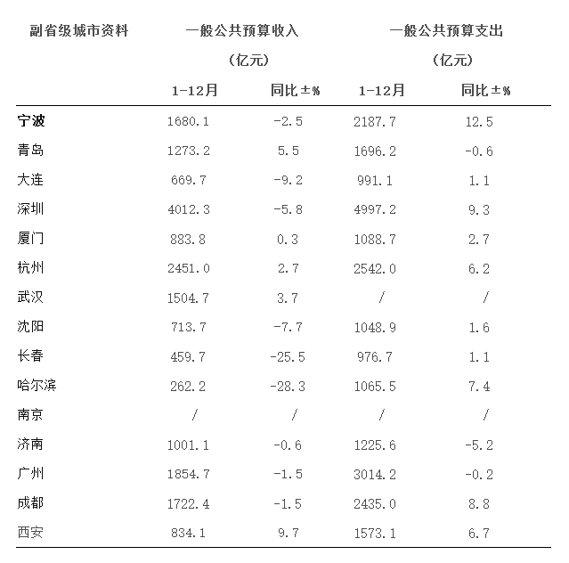 一般公共預(yù)算收入方面,除資料缺失的南京外,14座城市中有9座城市出現(xiàn)負(fù)增長(zhǎng),其中哈爾濱去年一般公共預(yù)算收入262.2億元,增速為-28.3%,一般公共預(yù)算支出1065.5億元,增速為7.4%。