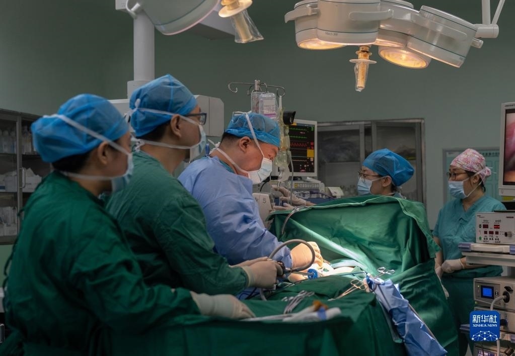 在北京市第六醫(yī)院的醫(yī)聯(lián)體胸外科病房手術(shù)室,北京協(xié)和醫(yī)院與北京市第六醫(yī)院的醫(yī)護(hù)人員進(jìn)行團(tuán)隊協(xié)作開展胸腔鏡手術(shù)(2021年6月3日攝)。新華社記者 才揚 攝