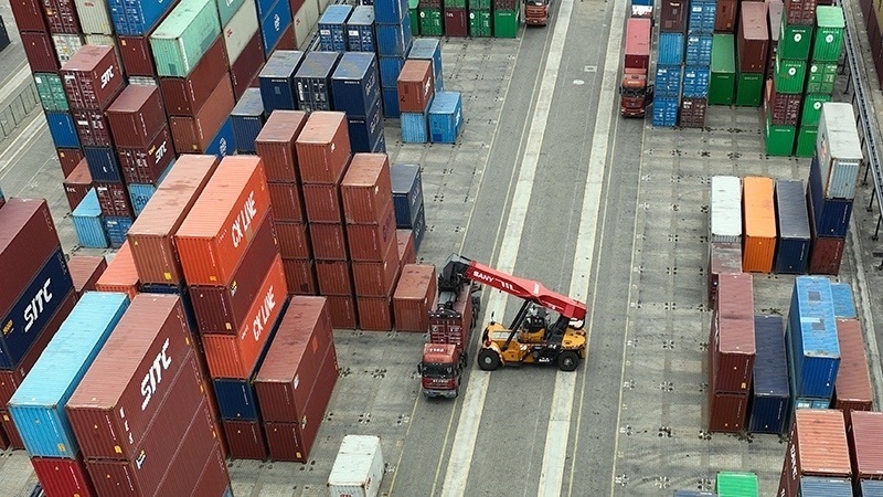 2023年2月15日,工人在廣西欽州港集裝箱碼頭駕駛裝卸車調(diào)運集裝箱(無人機照片)。