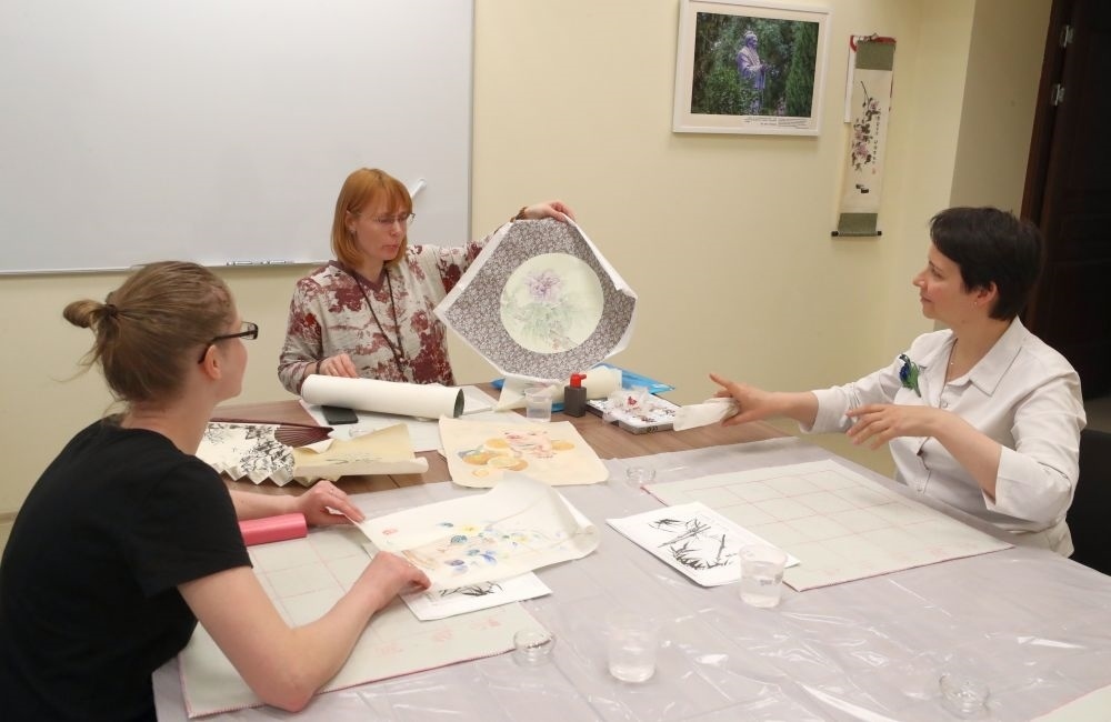 白俄羅斯藝術愛好者馬爾季涅夫斯卡婭(中)在明斯克的白俄羅斯國立大學孔子學院教授中國繪畫。