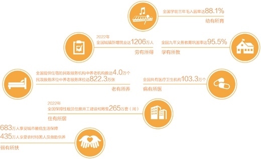 實實在在的舉措,帶來了實實在在的成效。城鄉(xiāng)學前教育公共服務(wù)體系基本建成,學前三年毛入園率由2011年的62.3%提高到2021年的88.1%。堅持政府舉辦義務(wù)教育,九年義務(wù)教育鞏固率達95.5%,初中在校生5120.6萬人,普通小學在校生10732.0萬人;實施就業(yè)優(yōu)先戰(zhàn)略,確保就業(yè)局勢總體穩(wěn)定,2022年城鎮(zhèn)新增就業(yè)達1206萬人,脫貧人口務(wù)工規(guī)模3278萬人,100個城市公共就業(yè)服務(wù)機構(gòu)求人倍率為1.46,繼續(xù)保持在1以上,崗位供給大于求職人數(shù);著力解決群眾看病難、看病貴問題,人民健康水平穩(wěn)步提升,全國共有醫(yī)療衛(wèi)生機構(gòu)103.3萬個,醫(yī)療衛(wèi)生機構(gòu)床位975萬張,參加基本醫(yī)療保險人數(shù)達到134570萬人;不斷推進養(yǎng)老事業(yè)和養(yǎng)老產(chǎn)業(yè)協(xié)同發(fā)展,養(yǎng)老服務(wù)體系更加健全,全國提供住宿的民政服務(wù)機構(gòu)中養(yǎng)老機構(gòu)達4.0萬個,民政服務(wù)床位中養(yǎng)老服務(wù)床位達822.3萬張;加快推進住房保障和供應(yīng)體系建設(shè),2022年全年全國各類棚戶區(qū)改造開工134萬套,基本建成181萬套,全國保障性租賃住房開工建設(shè)和籌集265萬套(間),群眾居住條件不斷改善;扎實做好因疫因災(zāi)遇困群眾和老弱病殘等特殊群體的基本生活保障,2022年年末,683萬人享受城市最低生活保障,435萬人享受農(nóng)村特困人員救助供養(yǎng),全年臨時救助1083萬人次,保障網(wǎng)越織越密實。