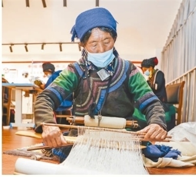 四川省涼山彝族自治州昭覺縣南坪社區(qū)的彝繡工坊內(nèi),易地扶貧搬遷到此的婦女在紡織布匹,就近就業(yè),實現(xiàn)穩(wěn)定脫貧。新華社記者 沈伯韓攝