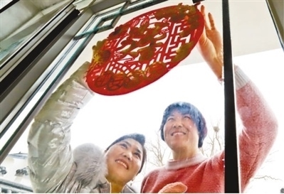 甘肅省張掖市臨澤縣鴨暖鎮(zhèn)屯泉小鎮(zhèn)彩蝶灣社區(qū),剛剛遷進新居的村民在窗戶上貼窗花。王 將攝(影像中國)