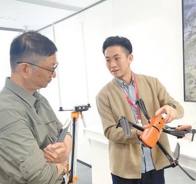 廣東分社記者李剛(左)在廣東省深圳市道通智能航空技術(shù)股份有限公司采訪。炎 琳攝