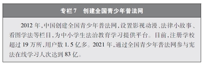 加強(qiáng)青少年網(wǎng)絡(luò)法治宣傳教育。青少年是祖國的未來、民族的希望。青少年網(wǎng)民在中國網(wǎng)民中的占比逐步增長。作為互聯(lián)網(wǎng)的“原住民”,青少年是網(wǎng)上學(xué)習(xí)、交流、生活最活躍的參與者、實踐者,其合法權(quán)益也更易受到網(wǎng)絡(luò)違法活動的侵害。中國從保護(hù)青少年網(wǎng)絡(luò)權(quán)益,促進(jìn)青少年健康成長、全面發(fā)展出發(fā),遵循青少年身心發(fā)展規(guī)律,貼近青少年學(xué)習(xí)生活實際,聚焦網(wǎng)絡(luò)沉迷、網(wǎng)絡(luò)欺凌、網(wǎng)絡(luò)淫穢色情信息等重點問題,通過普法微綜藝、兒童普法話劇、網(wǎng)絡(luò)普法故事廣播、網(wǎng)絡(luò)普法云課堂、學(xué)法用法知識競賽、法治副校長進(jìn)校園、編寫網(wǎng)絡(luò)普法讀本等生動活潑、豐富多彩的形式開展法治宣傳教育,逐步形成了政府、社會、學(xué)校、家庭相結(jié)合的法治宣傳教育格局,為提升青少年網(wǎng)民法治意識和網(wǎng)絡(luò)安全素養(yǎng)提供了全面保障。