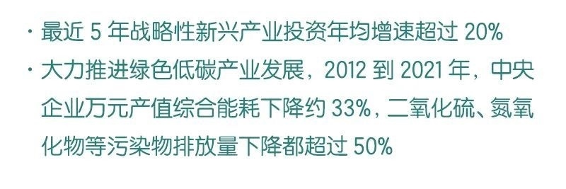 ◆ 截至目前,中央企業(yè)在涉及國家安全和國計民生等領域的營業(yè)收入占比超過70%,最近5年戰(zhàn)略性新興產業(yè)投資年均增速超過20%。