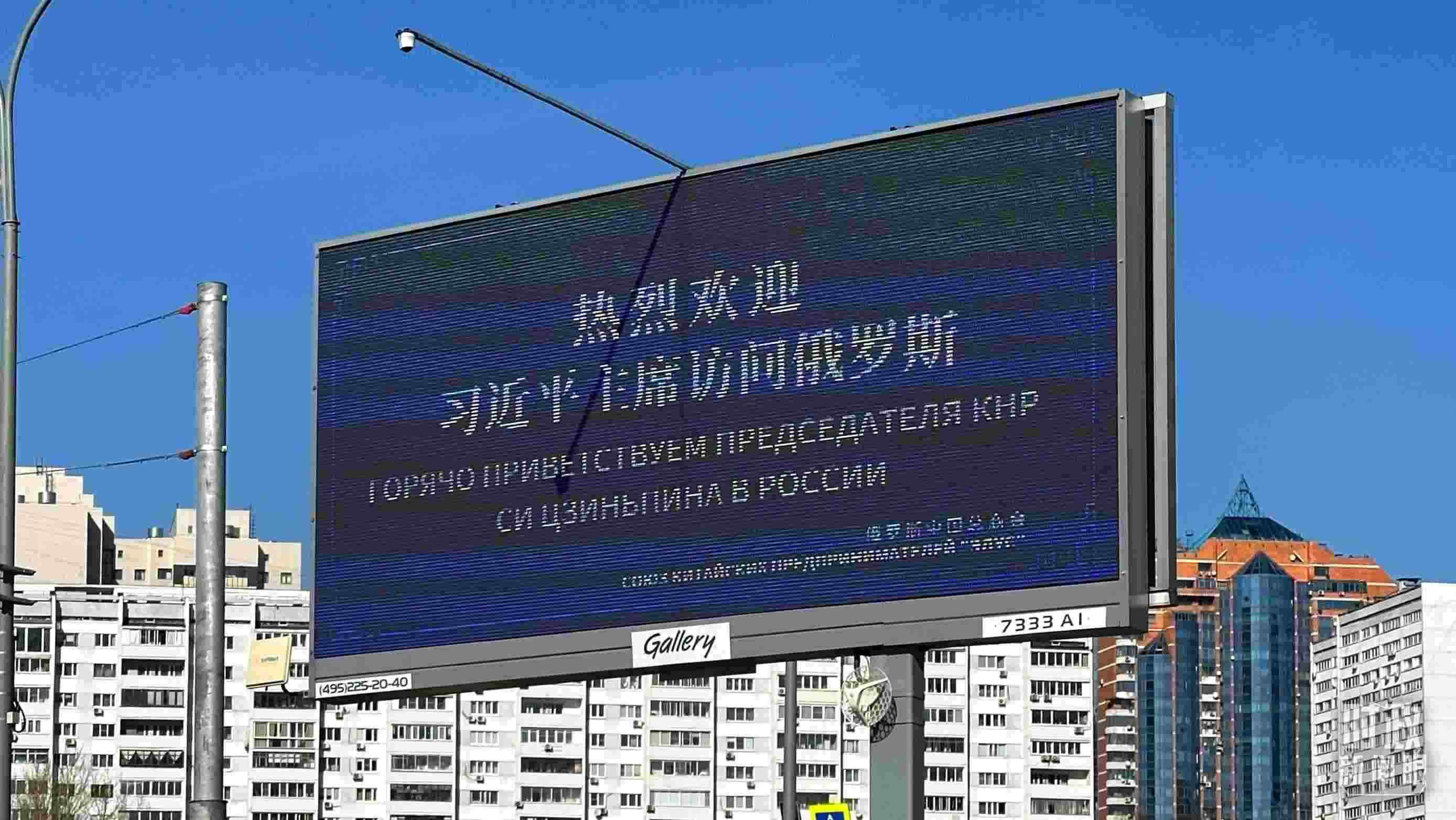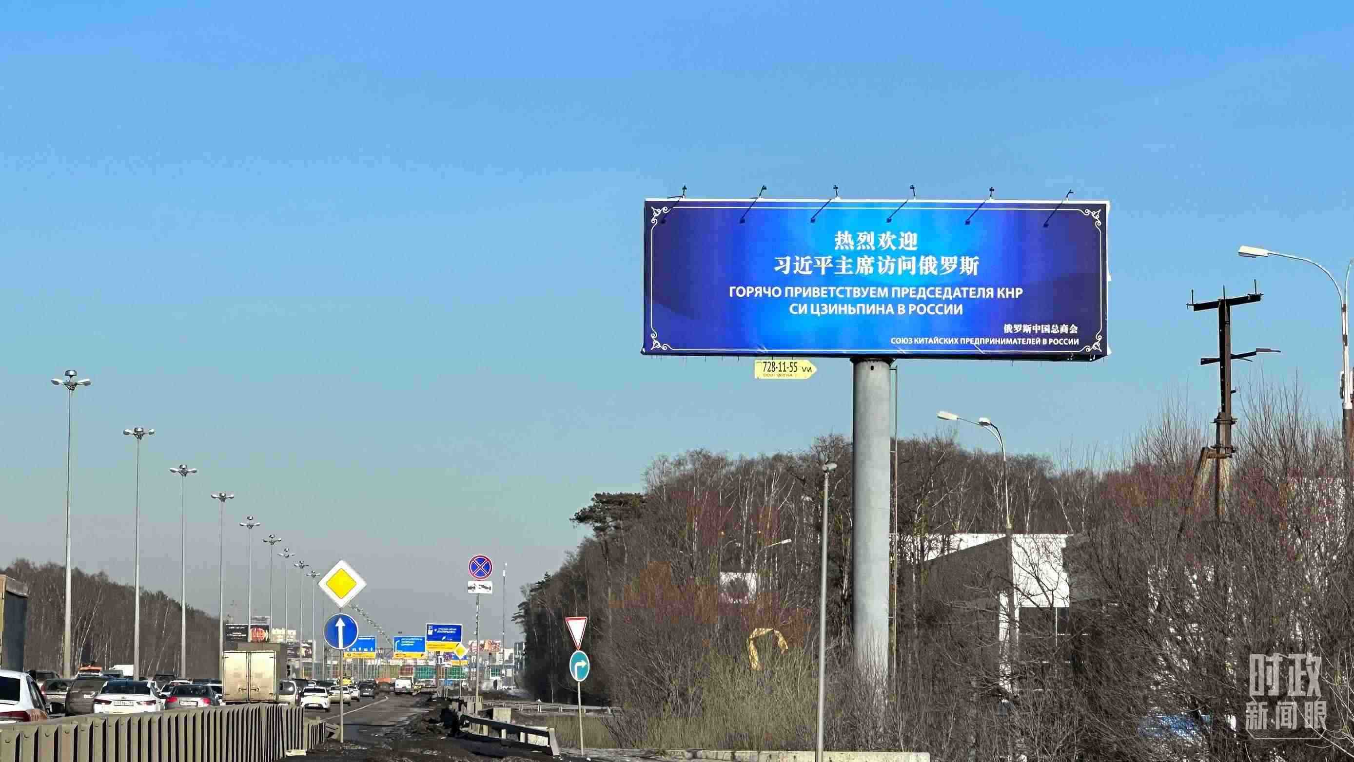 △莫斯科街頭,“熱烈歡迎習(xí)近平主席訪問俄羅斯”的歡迎標語。(總臺央視記者覃思拍攝)