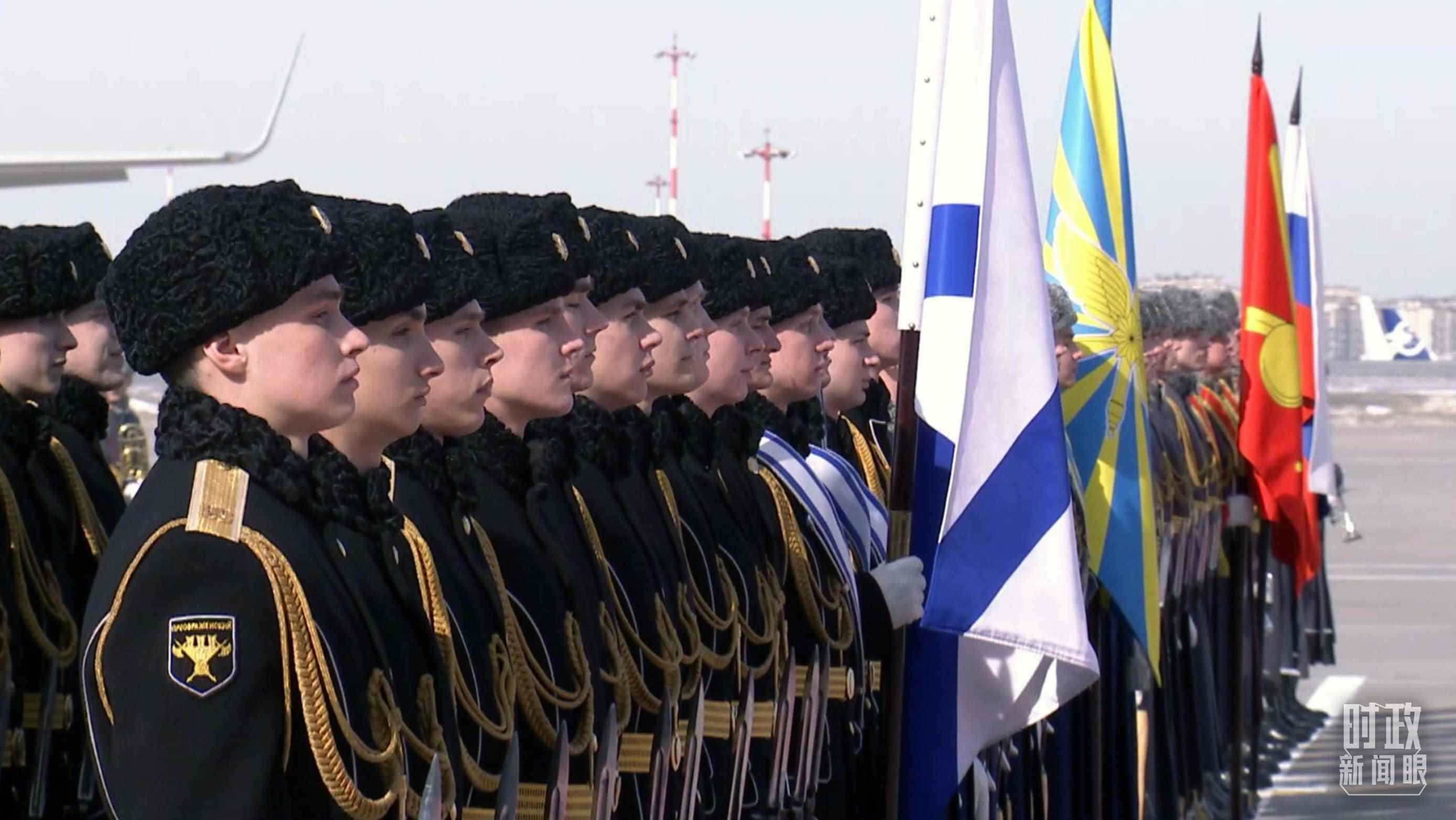 俄方在機場舉行隆重迎賓儀式。軍樂團奏中俄兩國國歌。習(xí)主席檢閱俄羅斯三軍儀仗隊并觀看分列式。
