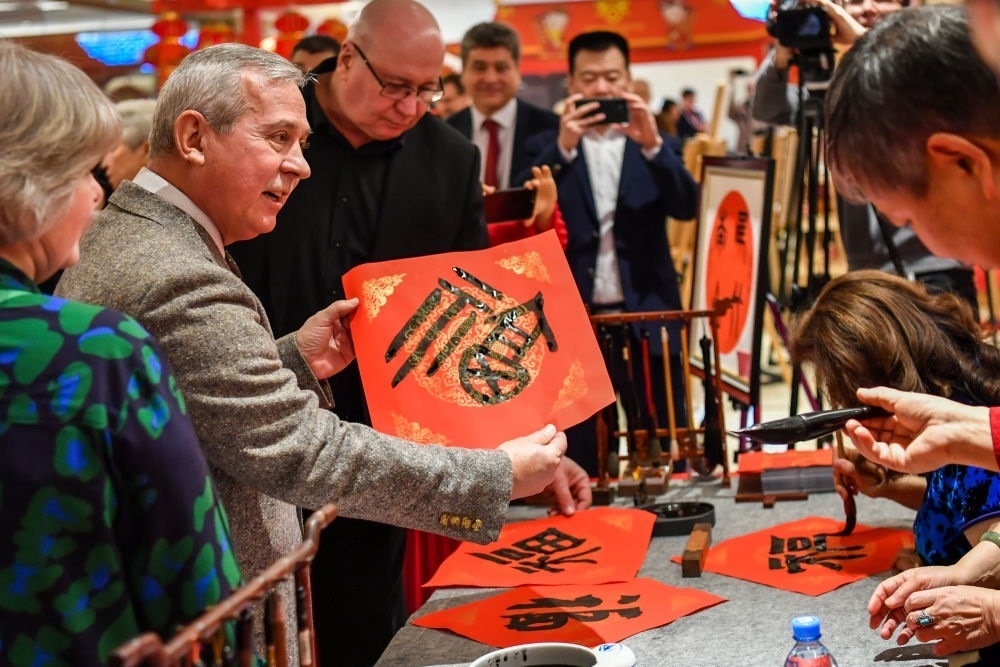 ↑2023年1月20日,來(lái)賓在俄羅斯莫斯科舉行的“歡樂春節(jié)—中國(guó)文化廟會(huì)”活動(dòng)上接到福字。中俄兩國(guó)人文交流日益密切,中俄友好社會(huì)民意基礎(chǔ)愈加穩(wěn)固。