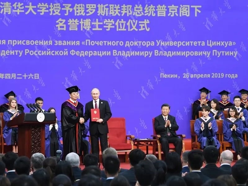2019年4月,普京總統(tǒng)率團(tuán)來華,出席第二屆“一帶一路”國際合作高峰論壇。期間,在北京友誼賓館,中方還有一項(xiàng)特殊安排:清華大學(xué)向普京總統(tǒng)授予名譽(yù)博士學(xué)位。