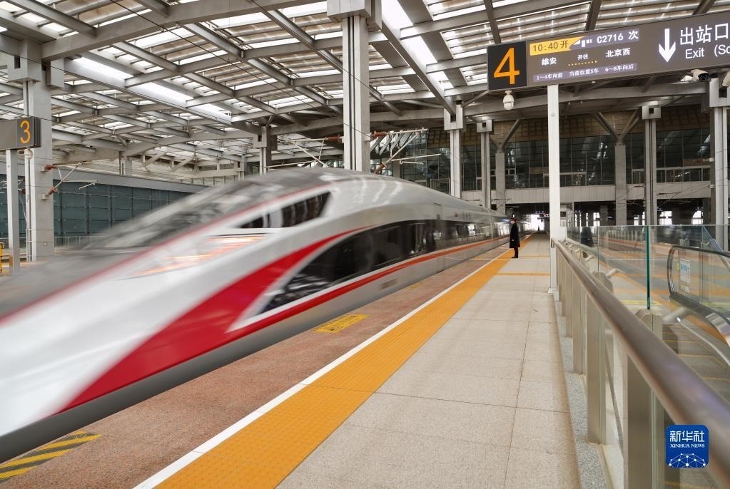 一輛高鐵列車駛離京雄城際鐵路雄安站,開往北京(2023年3月22日攝)。新華社記者 牟宇 攝