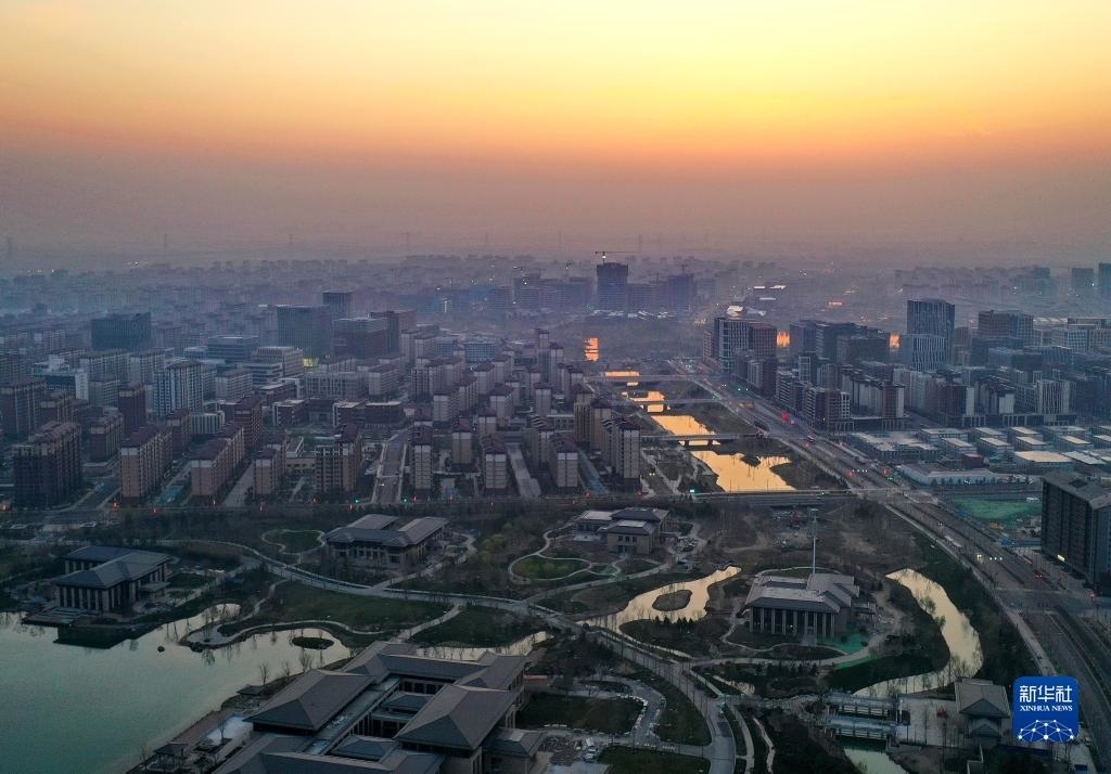 雄安新區(qū)容東片區(qū)內(nèi)的水系沐浴在晨光中(2023年3月31日攝,無人機(jī)照片)。新華社記者 牟宇 攝
