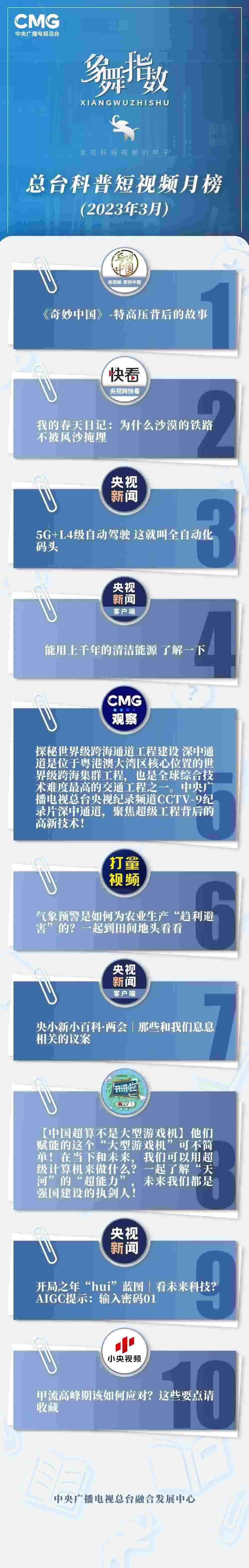 中央廣播電視總臺(tái)“象舞指數(shù)”評(píng)議品牌,推出科普短視頻月榜、總臺(tái)科普短視頻月榜。在2023年3月,值得注目的內(nèi)容有: