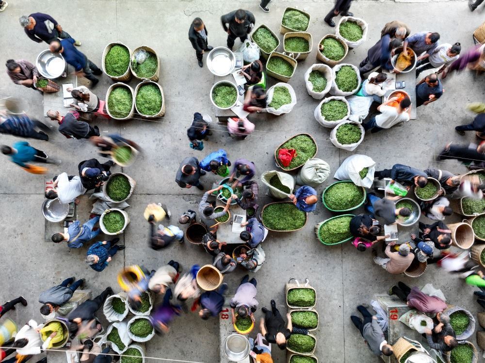 茶商在貴州省遵義市湄潭縣湄江茶青交易市場內(nèi)收購茶青(無人機照片,2023年4月4日攝)。新華社記者 歐東衢 攝