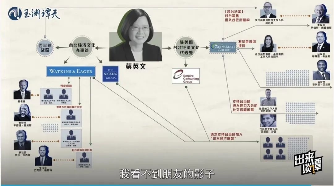 趁熱再打鐵,玉淵譚天繼續(xù)抽絲剝繭,以數(shù)據(jù)視頻《起底!臺當局“朋友圈”大公開》深扒臺當局近兩年在美國登記在冊的游說方式與對象,用翔實的數(shù)據(jù),揭秘了臺當局能接觸到的美國會人員多為邊緣人的真相,結合送“保護費”、送“官職”等賣臺行為實錘,讓臺當局在所謂“美臺關系”中的卑微姿態(tài)展露無遺。