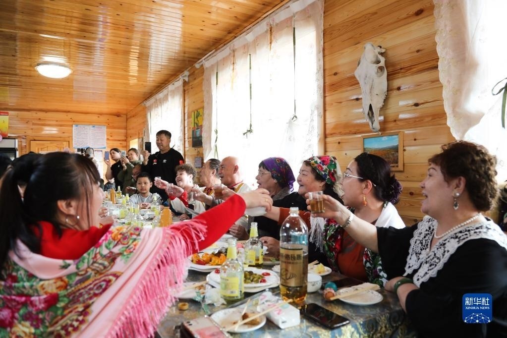 當(dāng)日,內(nèi)蒙古呼倫貝爾市額爾古納市恩和俄羅斯族民族鄉(xiāng)的俄羅斯族群眾穿著鮮艷的民族服飾,載歌載舞,歡度巴斯克節(jié)。已被列入國(guó)家級(jí)非物質(zhì)文化遺產(chǎn)名錄的巴斯克節(jié)是俄羅斯族一年中最隆重的節(jié)日,在為期一周的節(jié)日里,當(dāng)?shù)厝罕娖穱L美食、互相撞彩蛋、參加拔河、搶棍等活動(dòng)。