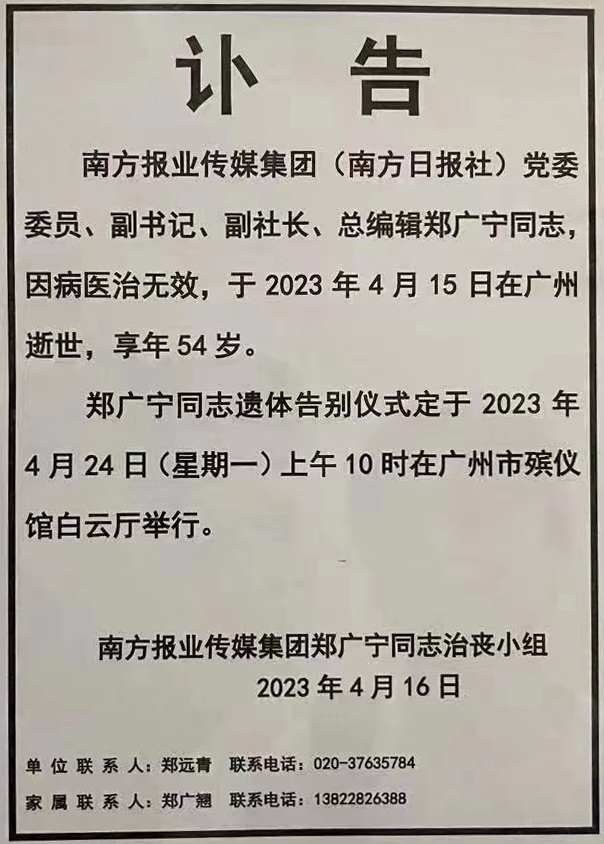 據(jù)南方報(bào)業(yè)傳媒集團(tuán)發(fā)布的訃告,南方報(bào)業(yè)傳媒集團(tuán)(南方日?qǐng)?bào)社)黨委委員、副書(shū)記、副社長(zhǎng)、總編輯鄭廣寧同志,因病醫(yī)治無(wú)效,于2023年4月15日在廣州逝世,享年54歲。