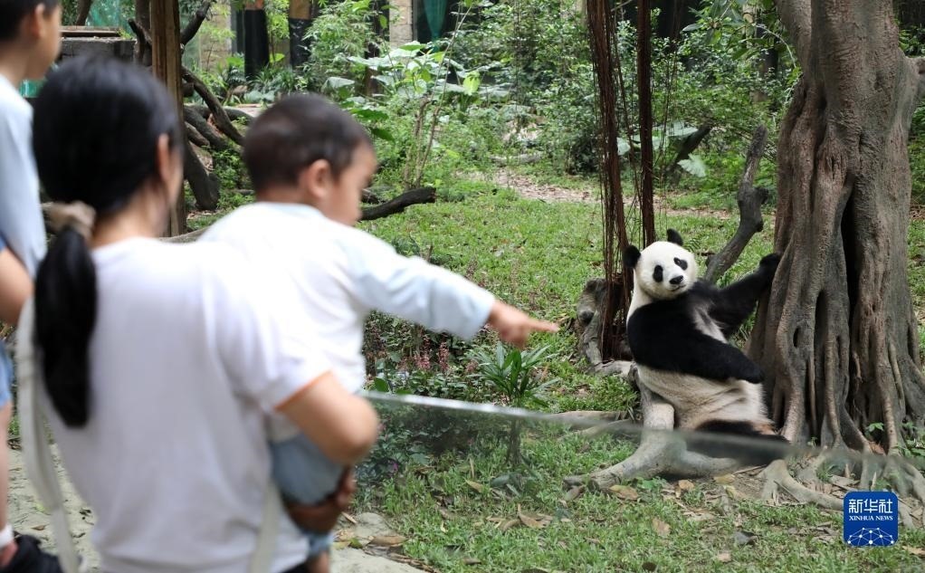 4月29日,在廣東廣州長隆野生動物世界,游客在觀賞大熊貓。