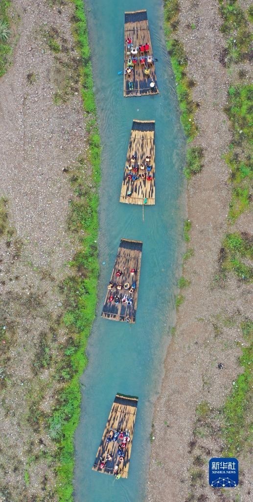 4月29日,游客在浙江省臺州市仙居縣永安溪體驗生態(tài)竹筏漂流(無人機照片)。