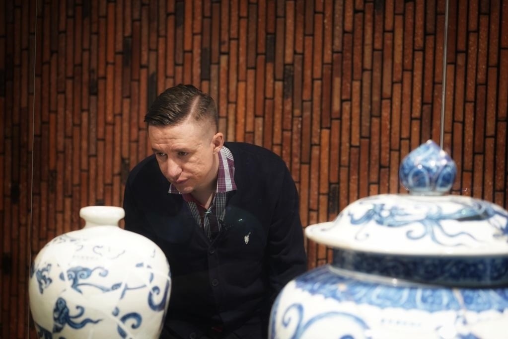 在江西景德鎮(zhèn)御窯博物院的展柜燈光下,一件青花瓷盤散發(fā)著藍(lán)白相間的光澤,疏密有致的葡萄紋在盤中心環(huán)繞生長(zhǎng),紋理細(xì)節(jié)清晰可見。這件燒制于約600年前的宣德青花葡萄紋菱口盤,吸引了來自烏茲別克斯坦的留學(xué)生紹夫卡特·沙穆拉托夫的目光。