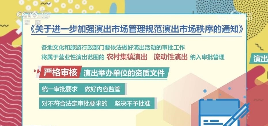 通知指出,各地文化和旅游行政部門要依法做好演出活動的審批工作,將屬于營業(yè)性演出范圍的農(nóng)村集鎮(zhèn)演出、流動性演出納入審批管理,嚴(yán)格審核演出舉辦單位的資質(zhì)文件,統(tǒng)一審批要求,做好內(nèi)容監(jiān)管。對不符合法定審批要求的,堅決不予批準(zhǔn)。文化和旅游行政部門要定期對演出場所進(jìn)行檢查,督促演出場所定期開展設(shè)施設(shè)備檢查,落實安全生產(chǎn)責(zé)任制。督促演出場所建立完善現(xiàn)場巡查制度,指定專人負(fù)責(zé)演出活動的巡查,做好現(xiàn)場觀眾管理,堅決防止擁擠、踩踏等事故發(fā)生,確保演出現(xiàn)場安全。各地文化和旅游行政部門要將社會關(guān)注度高、票務(wù)供需緊張的營業(yè)性演出作為重點監(jiān)管對象,提前進(jìn)行研判。督促演出舉辦單位、演出票務(wù)經(jīng)營單位面向市場公開銷售的營業(yè)性演出門票數(shù)量,不得低于核準(zhǔn)觀眾數(shù)量的70%。對在票務(wù)經(jīng)營中發(fā)現(xiàn)有炒票問題或可能造成不良影響的,應(yīng)當(dāng)及時約談演出舉辦單位和演出票務(wù)經(jīng)營單位,督促整改。要聯(lián)合屬地公安、市場監(jiān)管等部門,依法打擊“黃牛”炒票、虛假宣傳等違法違規(guī)行為,切實保障消費者合法權(quán)益。