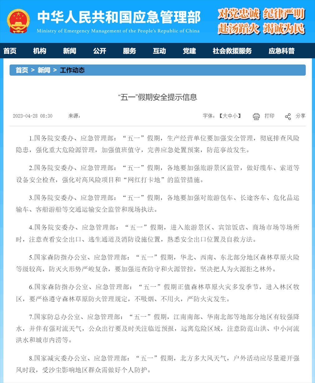 1.國務(wù)院安委辦、應(yīng)急管理部:“五一”假期,生產(chǎn)經(jīng)營單位要加強安全管理,徹底排查風(fēng)險隱患,強化重大危險源管理,加強值班值守,完善應(yīng)急處置預(yù)案,防范事故發(fā)生。