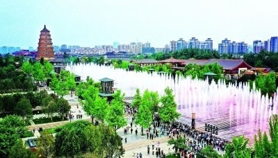 游人在陜西西安大雁塔北廣場(chǎng)觀看音樂(lè)噴泉表演。新華社發(fā)