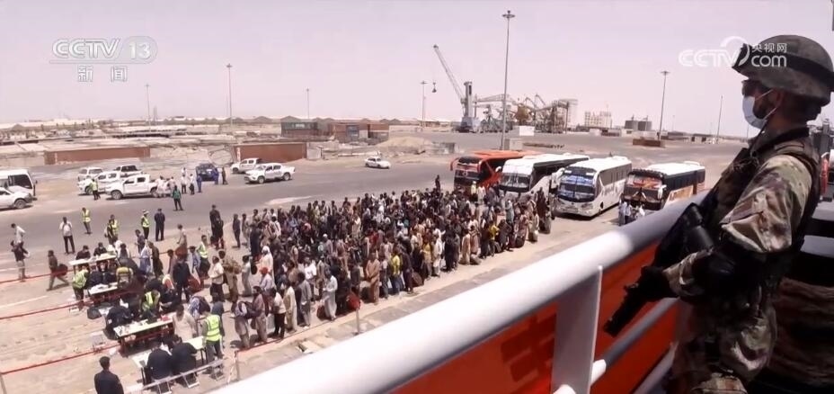 靠泊蘇丹港后,微山湖艦快速放下舷梯,官兵立即登上碼頭開展接收撤離人員準備工作。隨后搭載撤離人員的大巴車隊抵達碼頭,人員登記、安檢、登艦等工作緊張有序展開。