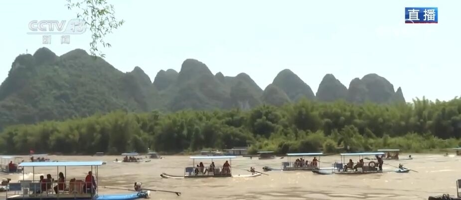 桂林山水甲天下,漓江沿線正是桂林山水最典型的代表。現(xiàn)在已經(jīng)是廣西的汛期,降雨開始增多。大家通過畫面可以看到,漓江的水不像前幾天那樣清澈,這是因?yàn)榍疤?,桂林剛剛?jīng)過一場強(qiáng)降雨,上游來水增加。在漓江之上,無論陰晴雨霧,都是不同的風(fēng)景。像今天這樣的晴天麗日,在漓江上穿行就像在欣賞一幅青綠山水;而在陰雨天,又像是穿行在傳統(tǒng)的水墨畫之中。根據(jù)桂林海事部門預(yù)測,“五一”假期,桂林水上發(fā)送旅客量超過30萬人次,這幾天旅游公司的船票基本上都是提前售完的狀態(tài)。