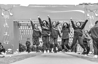 4月16日,安徽省安慶市田家炳中學(xué)高三學(xué)生在操場(chǎng)上游戲釋放壓力。江勝攝/光明圖片