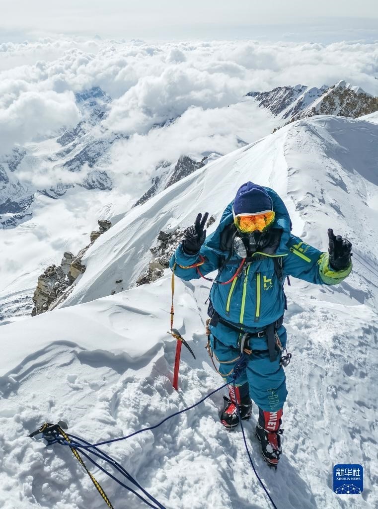 董紅娟在海拔8027米的希夏邦馬峰頂(4月26日攝)。新華社發(fā)(頓巴 攝)