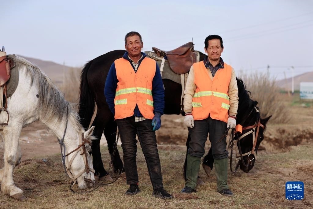 5月2日,河北省承德市豐寧滿族自治縣大灘鎮(zhèn)扎拉營(yíng)村的護(hù)林員趙世海(右)和羅金寶在海留圖國(guó)家濕地公園修復(fù)護(hù)欄。