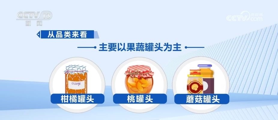 本屆廣交會上,就有近千種罐頭產(chǎn)品。從品類來看,主要以果蔬罐頭為主,柑橘罐頭、桃罐頭、蘑菇罐頭等等。另外,番茄醬罐頭以及竹筍罐頭也是中國果蔬罐頭出口的主要產(chǎn)品。小小中國罐頭,撬動了海外大市場。