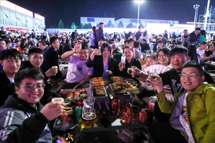 4月29日,游客在淄博市一家燒烤城吃燒烤。新華社發(fā)(朱偉攝)