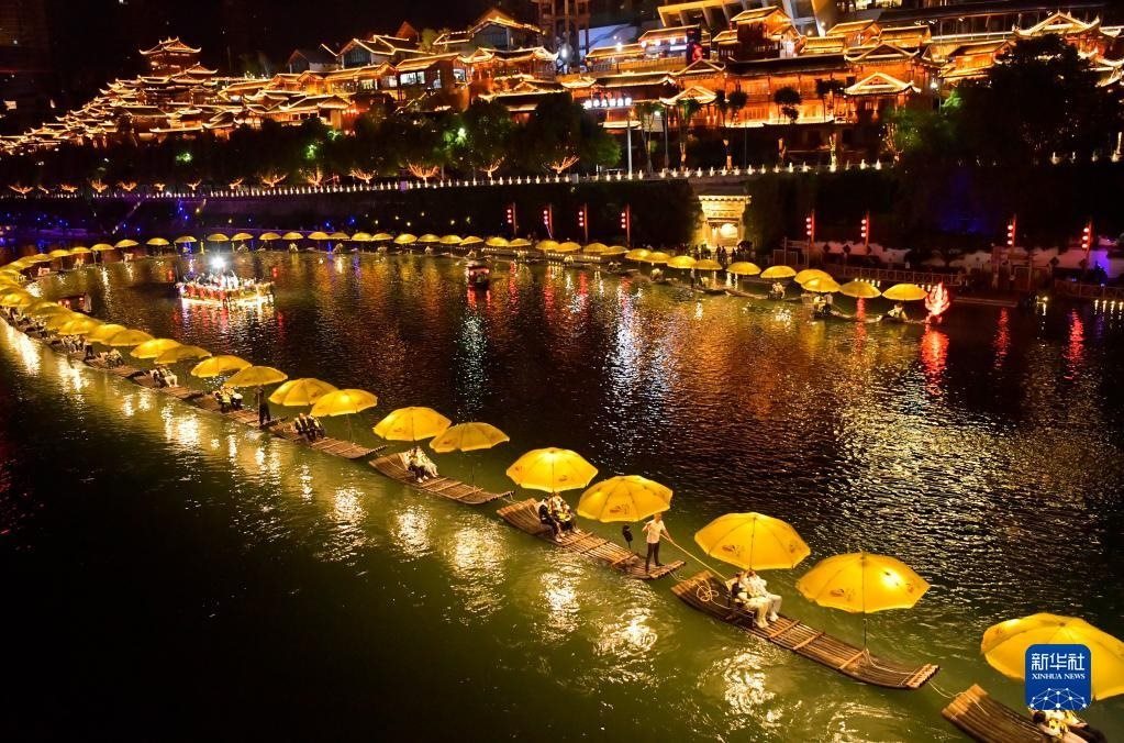 5月1日晚,游客在湖北省宣恩縣貢水河上乘坐竹筏欣賞夜色。