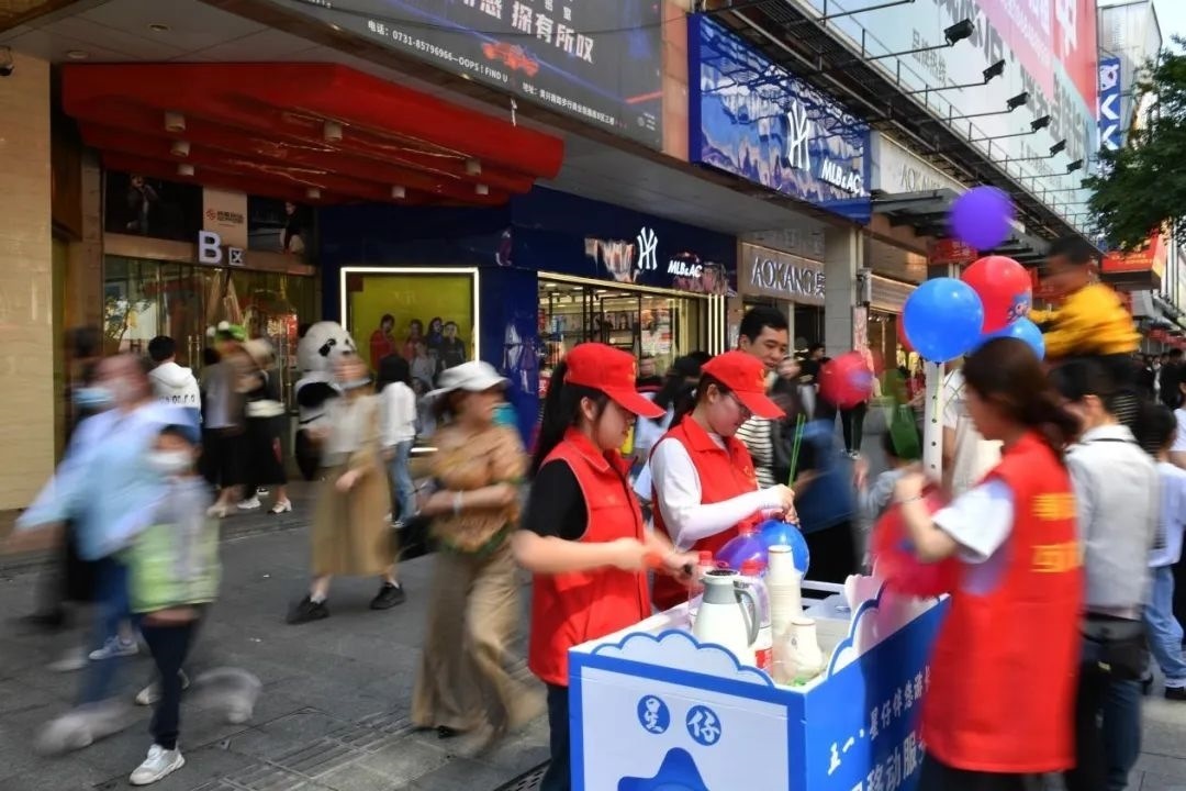 5月1日,志愿者在湖南省長(zhǎng)沙市天心區(qū)一處商圈做志愿服務(wù)。新華社記者 陳振海 攝