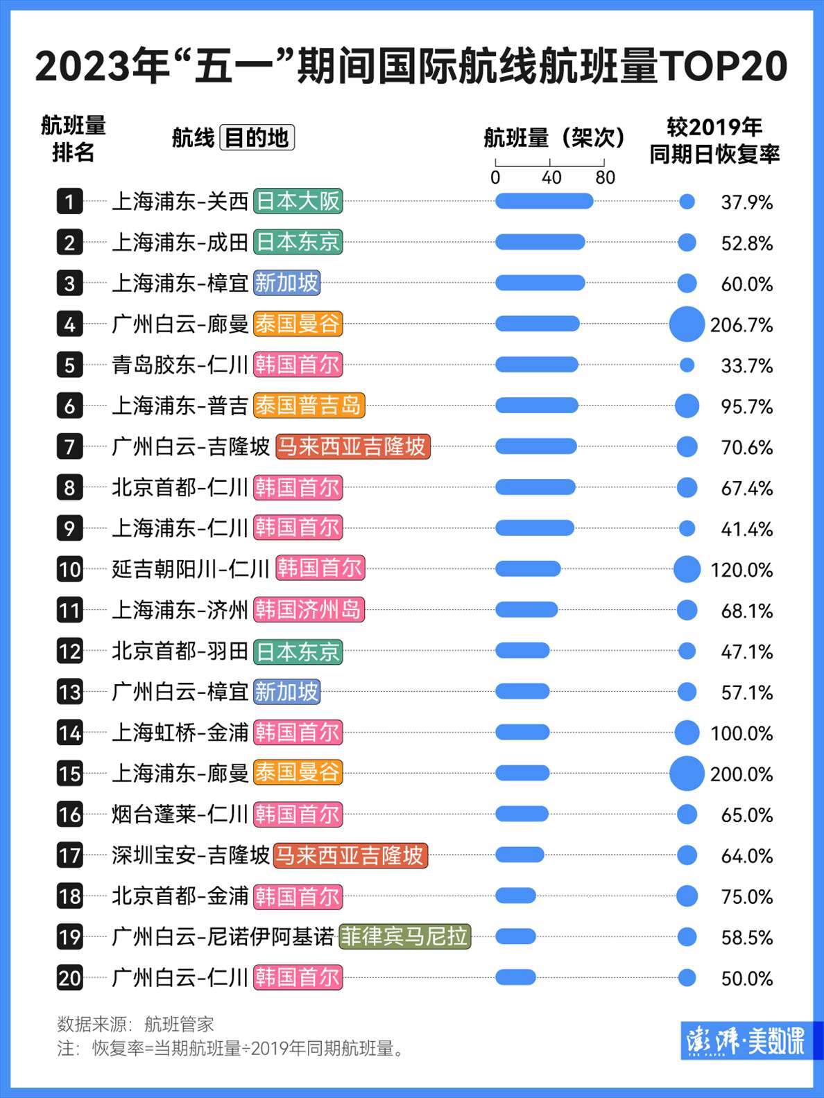 具體來(lái)看,今年“五一”期間航班量TOP20國(guó)際航線中,飛往泰國(guó)曼谷的“廣州白云-廊曼”和“上海浦東-廊曼”航班量已遠(yuǎn)超2019年同期水平,增幅超過(guò)100%。