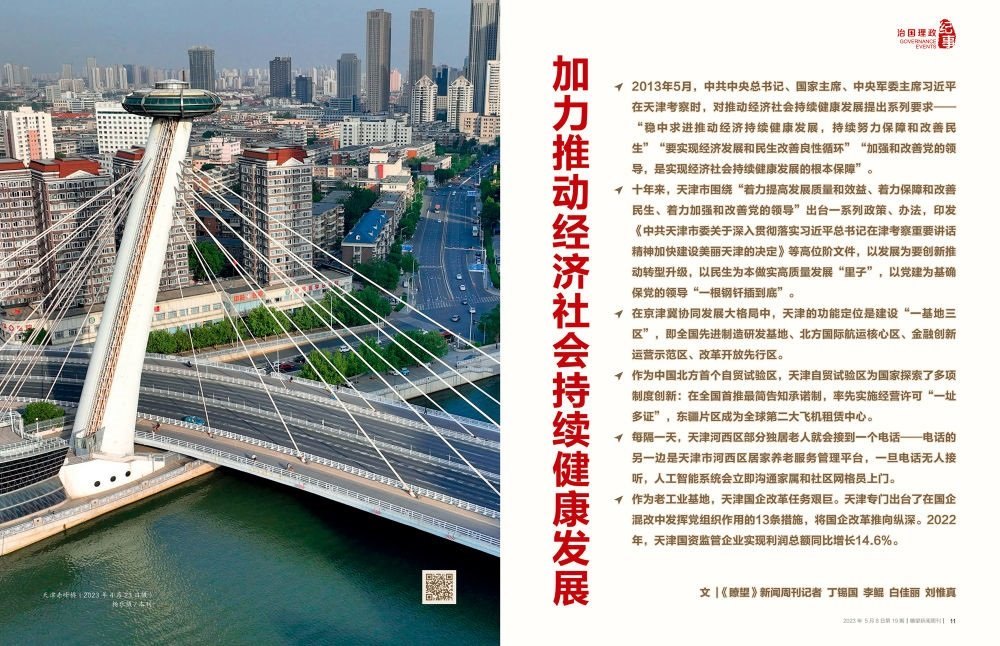 時光回到十年前。2013年5月,中共中央總書記、國家主席、中央軍委主席習(xí)近平在天津考察時,對推動經(jīng)濟社會持續(xù)健康發(fā)展提出系列要求——“穩(wěn)中求進(jìn)推動經(jīng)濟持續(xù)健康發(fā)展,持續(xù)努力保障和改善民生”“要實現(xiàn)經(jīng)濟發(fā)展和民生改善良性循環(huán)”“加強和改善黨的領(lǐng)導(dǎo),是實現(xiàn)經(jīng)濟社會持續(xù)健康發(fā)展的根本保障”。