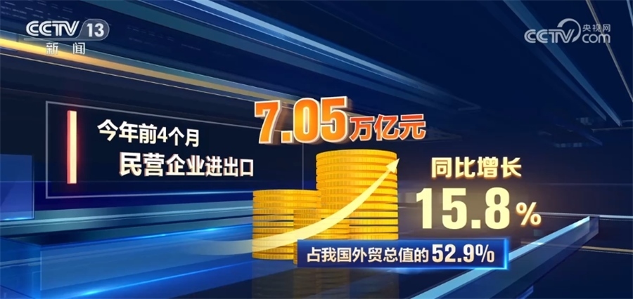 海關(guān)統(tǒng)計(jì)顯示,今年前4個(gè)月,民營企業(yè)進(jìn)出口7.05萬億元,同比增長(zhǎng)15.8%,占我國外貿(mào)總值的52.9%。
