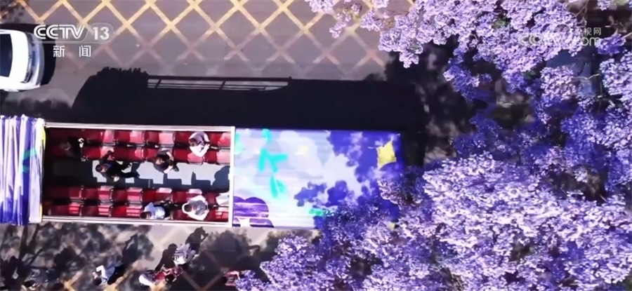 總臺記者 郭琳潔:我現(xiàn)在是在昆明的教場中路,5月上旬,道路兩側(cè)的藍(lán)花楹競相綻放,將這條1.4公里長的道路裝扮成一條紫色長廊。